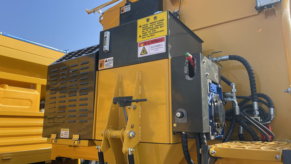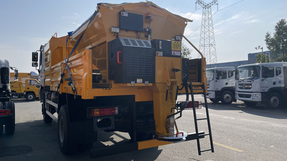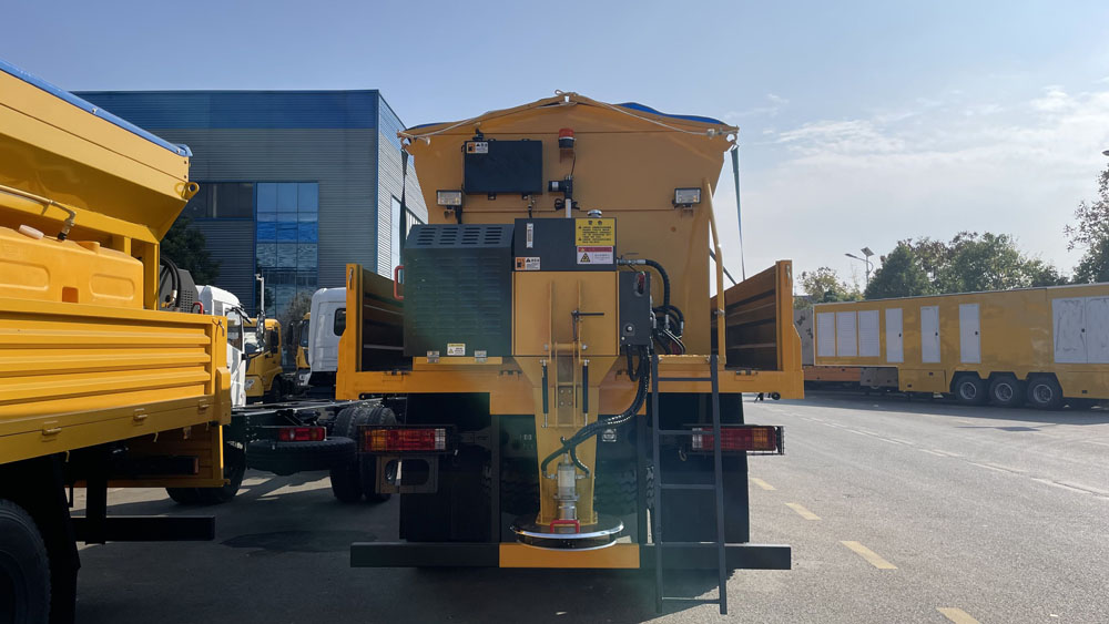 - 料箱設(shè)計(jì)合理:料箱容積較大,如有的型號(hào)可達(dá) 10m³,可減少加料次數(shù),提高作業(yè)效率。整機(jī)及料斗內(nèi)外采用碳鋼板結(jié)構(gòu),并進(jìn)行防腐處理,撒布盤(pán)為不銹鋼材質(zhì),具有良好的耐腐蝕性,適應(yīng)各種惡劣環(huán)境。料倉(cāng)上蓋有網(wǎng)柵,可有效過(guò)濾大塊融雪劑,防止其堵塞輸送裝置;頂部還裝有遮蓋帆布,能防止雨、雪進(jìn)入料倉(cāng),保證融雪劑的質(zhì)量和撒布機(jī)的正常使用.