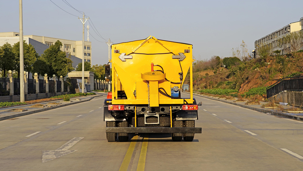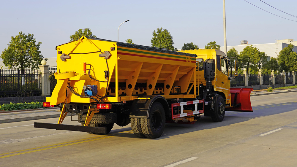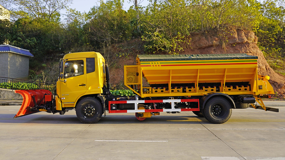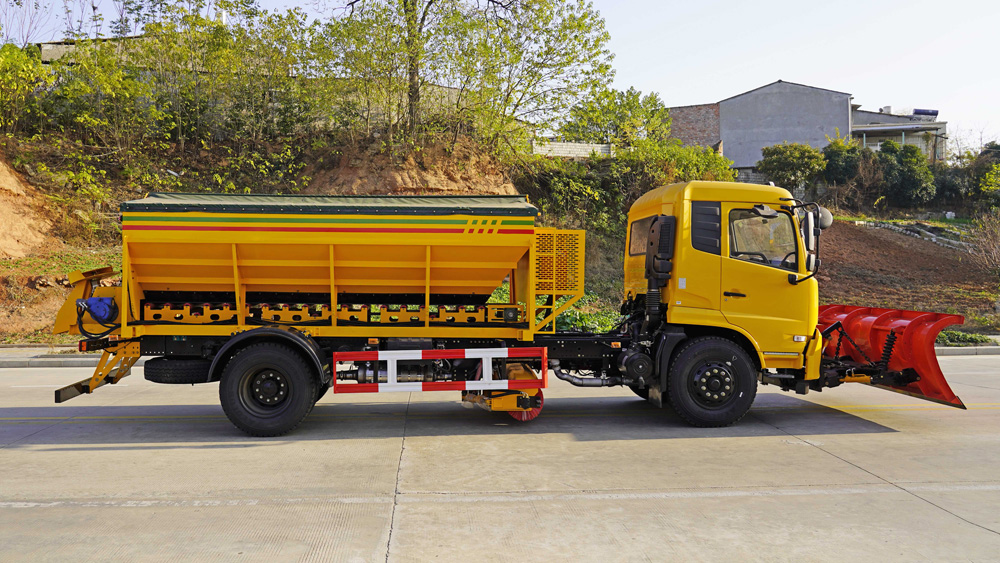 當后防護截面尺寸(mm):120×60時連接方式為螺栓連接;離地高度400mm;專用功能及裝置:該車主要用于冬季道路除雪、破冰、撒布作業(yè),
